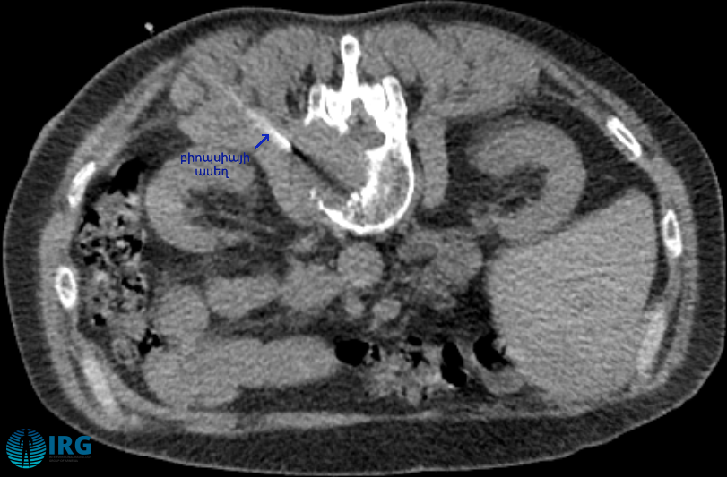 Բուժառուն զննվել է ուռուցքաբանի և ինտերվենցիոն ռադիոլոգի կողմից և ախտահարման բնույթը պարզելու նպատակով որոշվել է կատարել ասեղային տրեպան բիոպսիա՝ ՀՇ ուղղորդմամբ, տեղային անզգայացման պայմաններում։